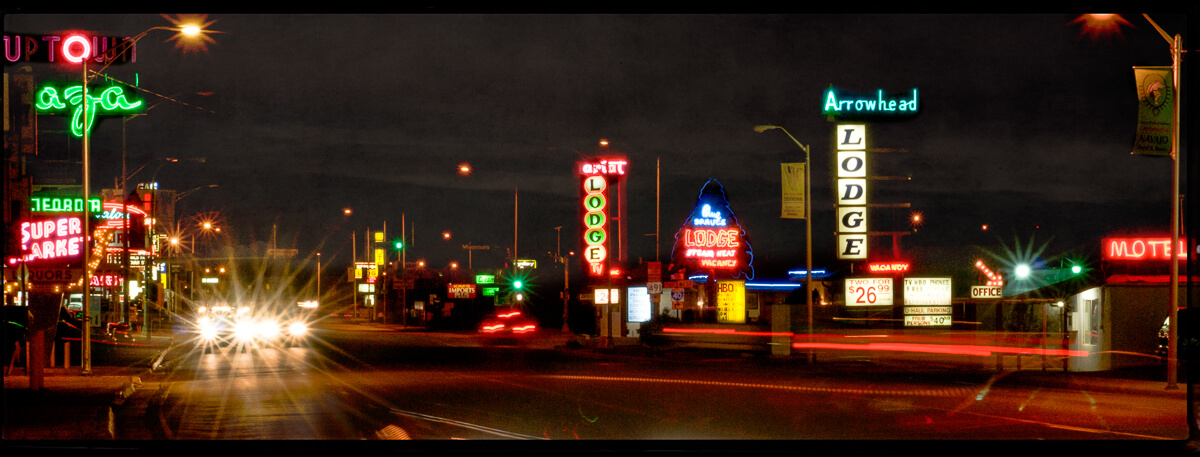 Back in 2012 on a southwest tour of the old Mother Road, I noticed a signature southwest cloud structure forming as the sun was sinking low. The upward rays of sunlight were starting to beam over the clouds. Recollecting the treasure trove of monumental neon approaching on the west side of Gallup, I knew I would soon be making some great captures.