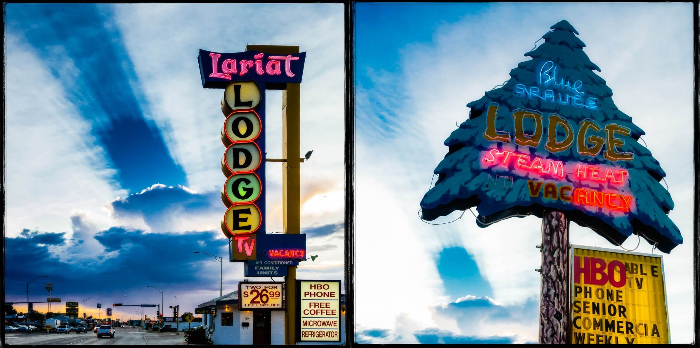 I made a right turn into the parking lot of The Lariat Lodge, parked the car and captured these two images of The Lariat and The Blue Spruce.