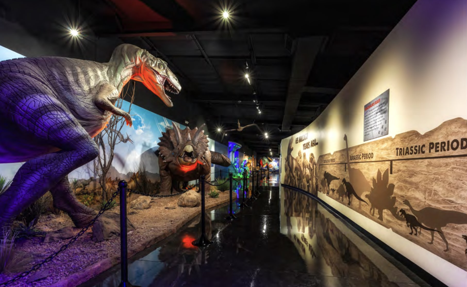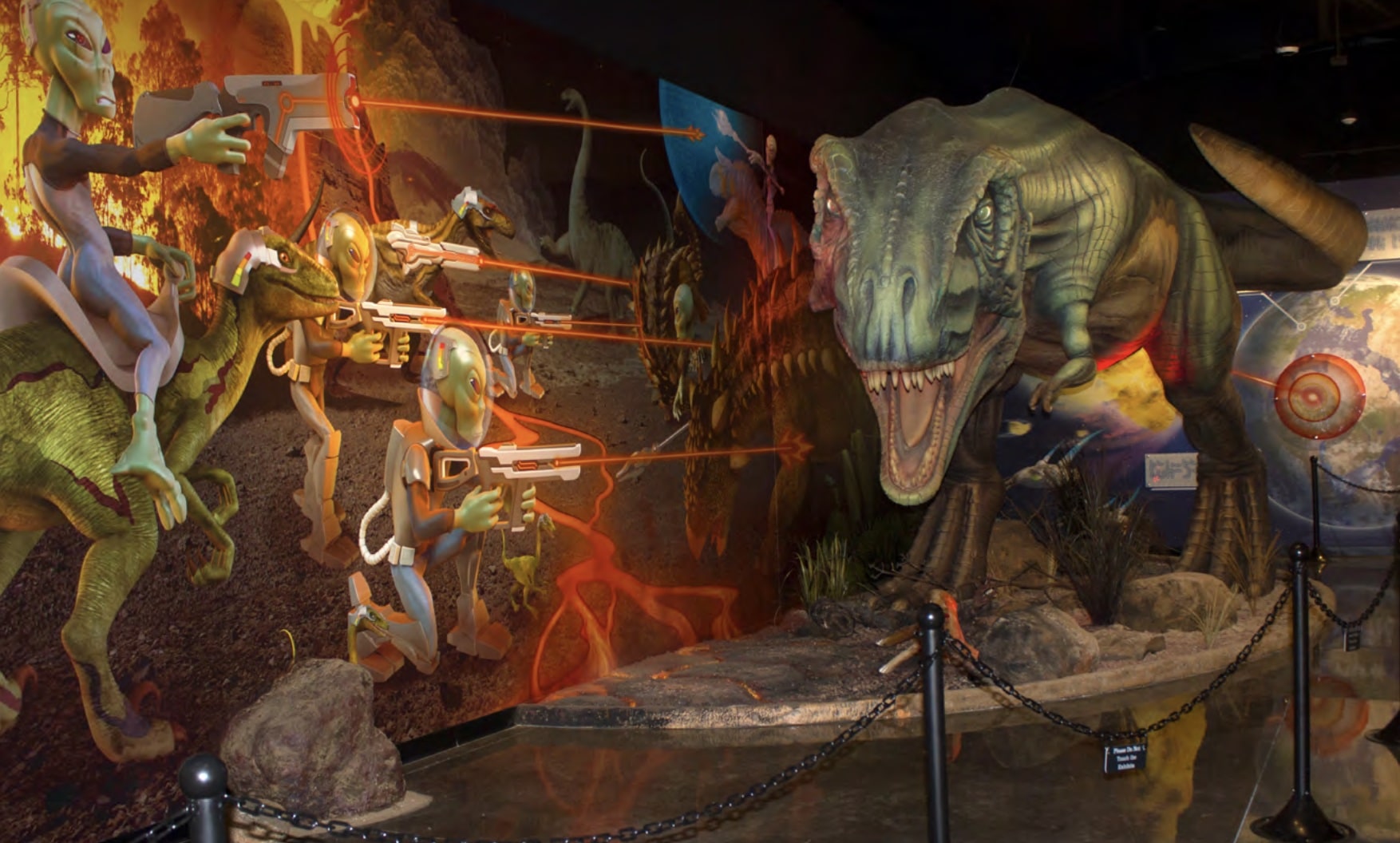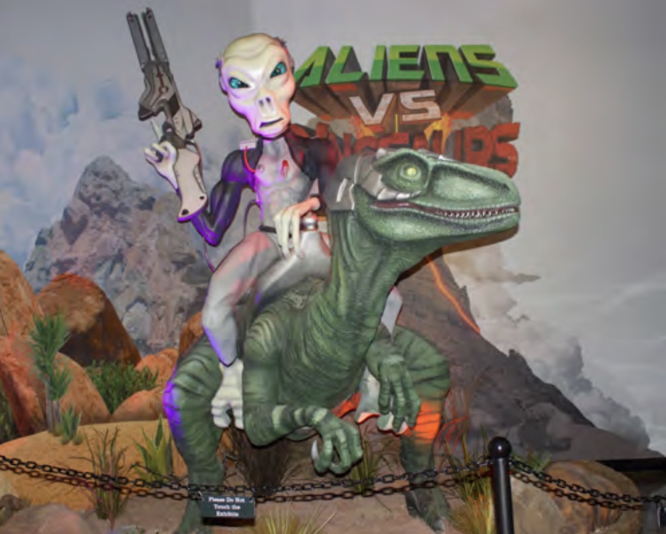“We kind of married the idea and notion of dinosaurs and aliens and created a storyline and actually created the theme, if you will, of aliens traveling to and finding Earth and integrating with the dinosaurs, basically enslaving dinosaurs,” said Kit Johnson, Director of Operations at Bowlin Travel Centers. “And the aliens, when they came, were of two descendants: one a good guy tribe, if you will, and a bad guy tribe. And they enslaved dinosaurs, until at some point, they were unable to accomplish that in total because of T-Rex and his power and, I guess, independence. And then, the destruction of—the big meteorite event was not really that—it was a blast coming from an alien spacecraft that destroyed all the dinosaurs. And then aliens began integrating themselves into society from that moment on and have had a huge effect on the history of our world—either good or bad. And there’s a ‘What if?’ theme. What if aliens actually did integrate with society? What if they really did have a lot to do with the way our history played out over time? And the last exhibit, of course, is The Thing, which ties into this theory of aliens’ involvement with humanoids, and The Thing actually being that key that ties it all together.”