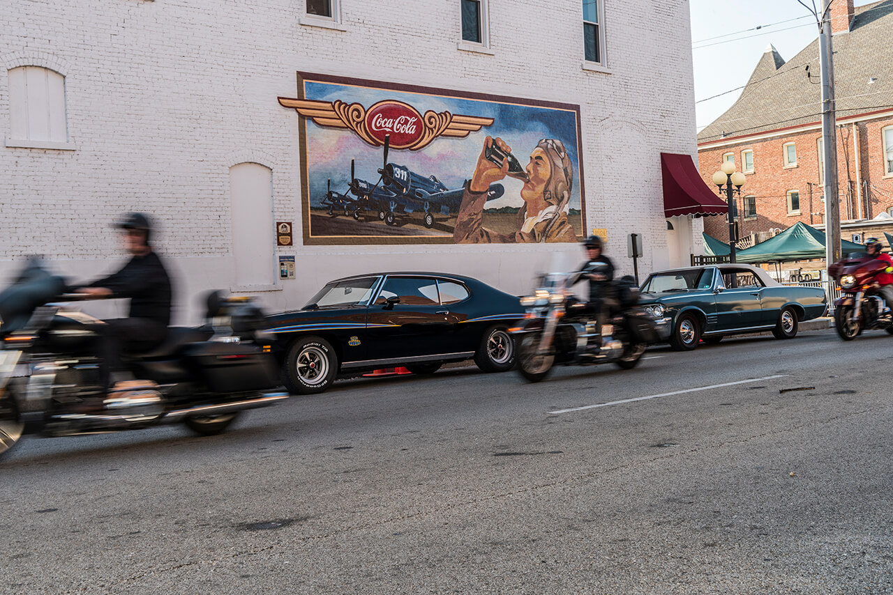 Motorcycle riders cruise downtown Pontiac, Illinois. When I capture riders on the road with my camera, I feel as if I was riding the motorcycles myself.