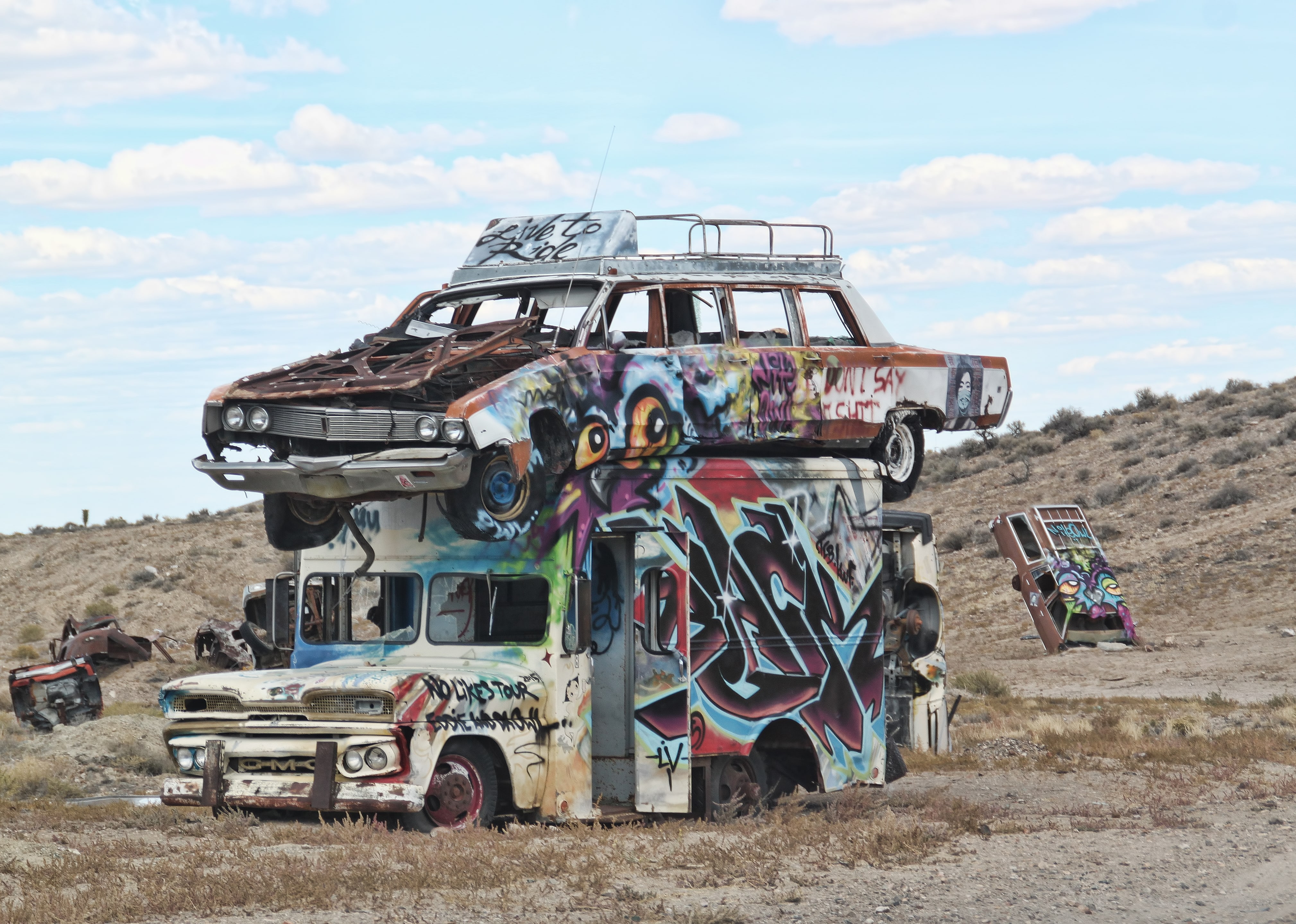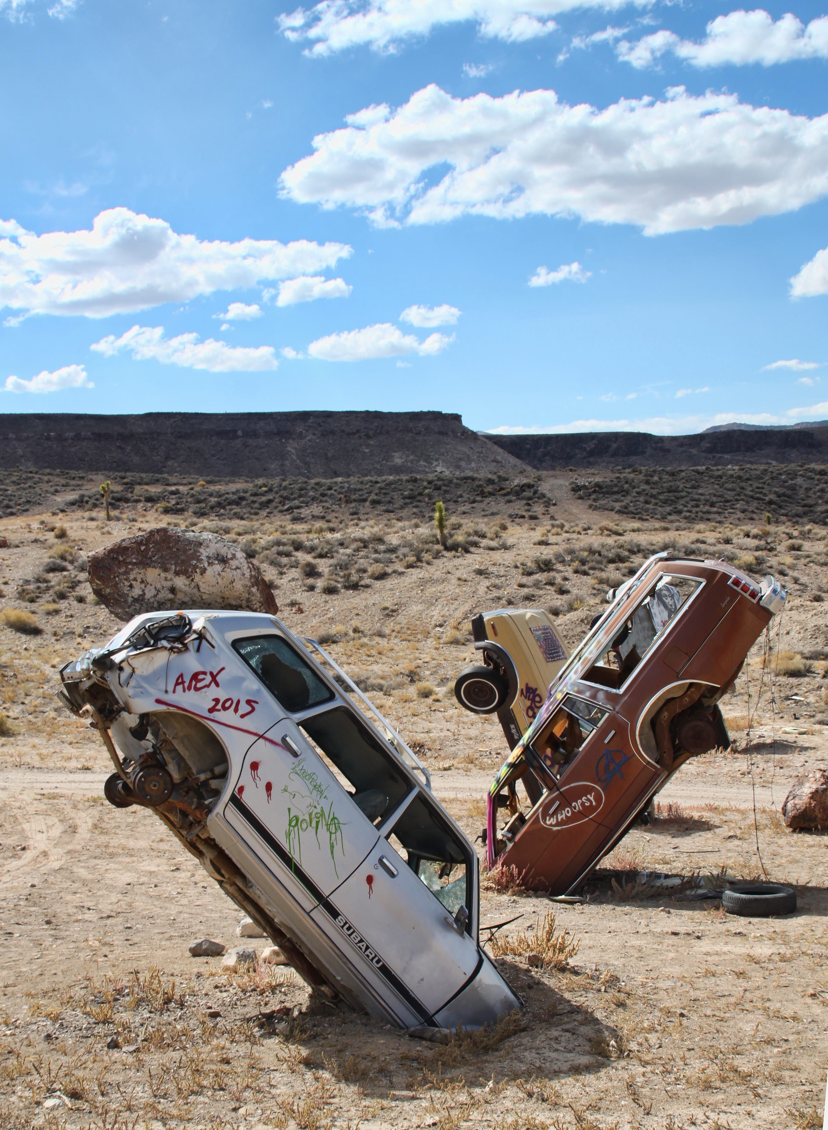 Work began in 2002 and continued over the next decade, using a backhoe and a lot of hard work to ‘plant’ the vehicles. Some were posed nose into the ground, some balanced on the top of others, some poised over mounds of earth. The idea was that the site would be a blank canvas for artists and would inspire graffiti, rather as the better-known Cadillac Ranch of Amarillo, Texas, ending up doing.